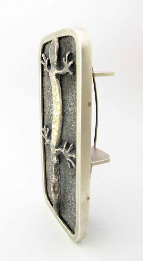 A bross különleges és szándékolt érdekessége, hogy igazán csak alaposan megvizsgálva, kézben forgatva adja meg a teljes tervezett élményt. Térlátás, – a két szem adta két nézőpont- szükséges ahhoz, hogy az agyunk összerakja azt a képet, ami a cizellált hasi oldalról és a kifűrészelt taraj negatívból egyesítve adja ki a gőte három dimenziós érzetét.