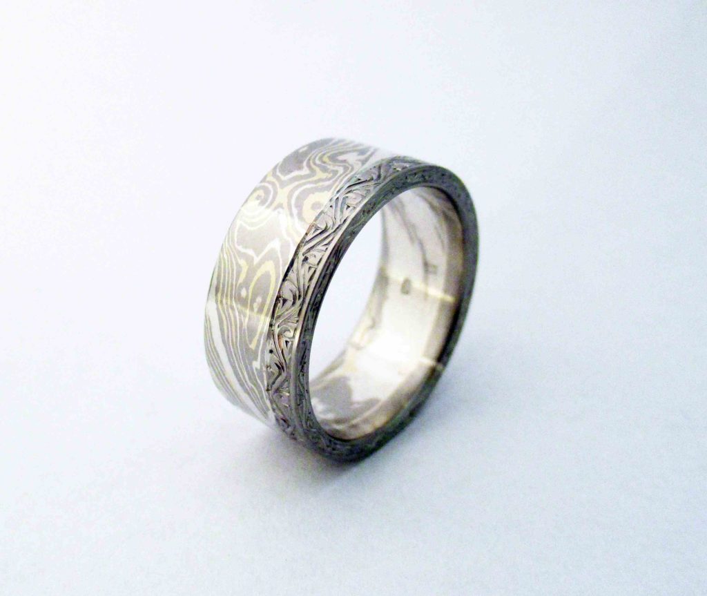 Az ékszer anyagai: zöldarany, ezüst és palládium. A hat mm széles mokume rész egy két mm széles oldalgyűrűt is kapott, melyet barokk repassé véséssel díszítettem.