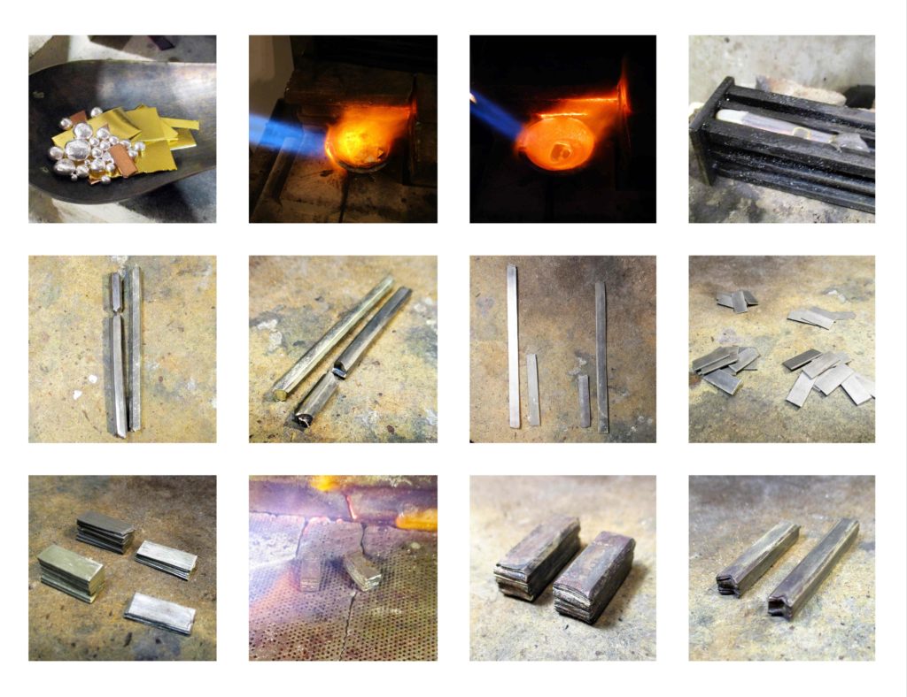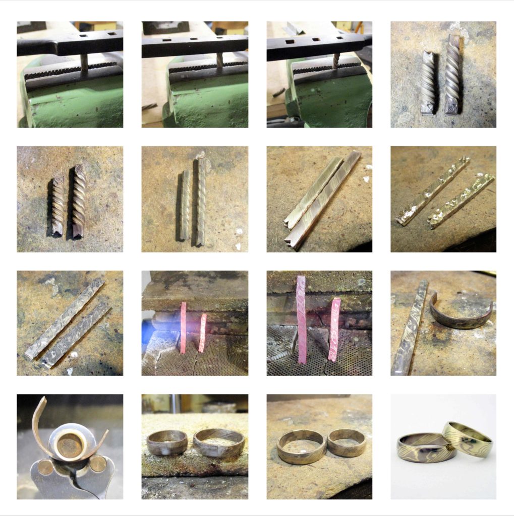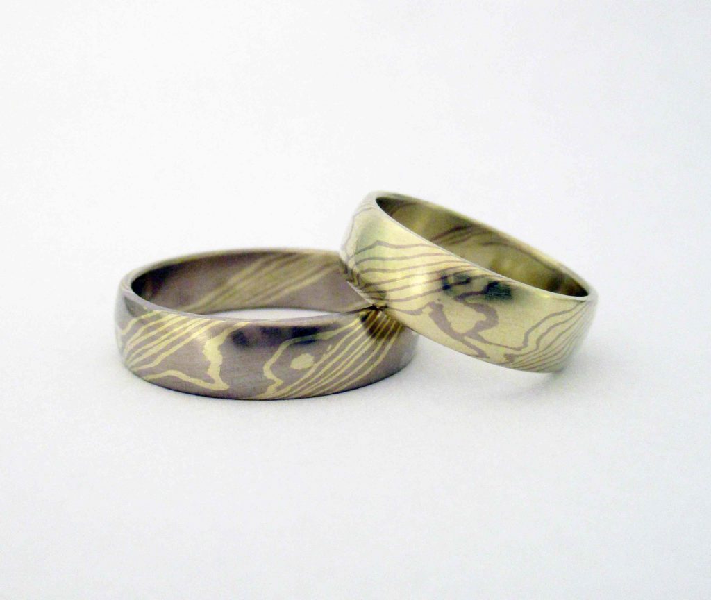 Zölradany és fehérarany komplenenter, ezúttal 6mm szélességgel. A nagy felületen gyönyörűen érvényesül a mokume gane minta. A férfi félben a fehérarany, míg a nőiben a zöldarany dominál. Más a kettő, de mégis egy egészet alkot. Szerintem itt kezdődik az egyensúly. 🙂