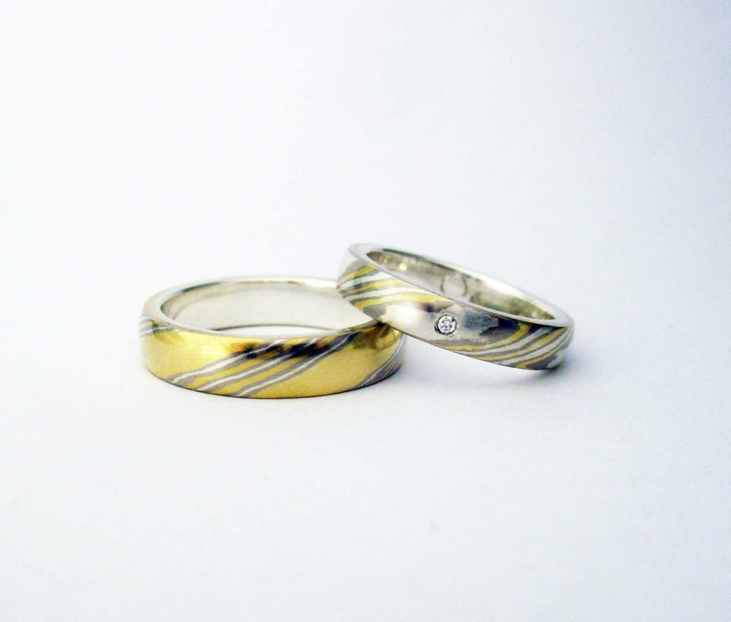 Ezúttal 3 nemesfémből késztült komplementer gyűrűpár. A paqlládium rétegek vastagsága azonos. Ám míg a nőiben az ezüst dominál a sárgaarannyal szemben, addig a férfi félben a sárgaarany a hangsúőlyos. Különböző, ám mégis egy pár. 🙂 A nőiben egy kis gyémánt is helye kapott 🙂