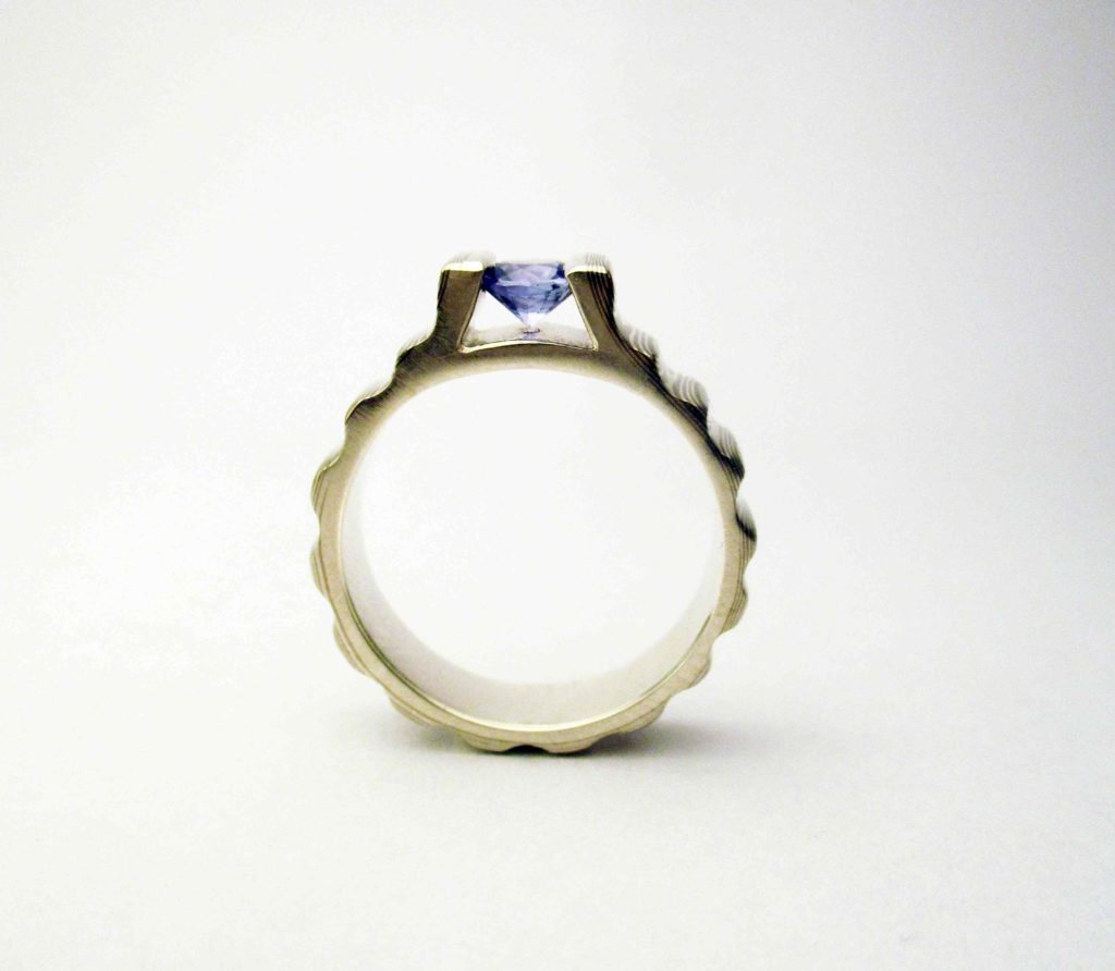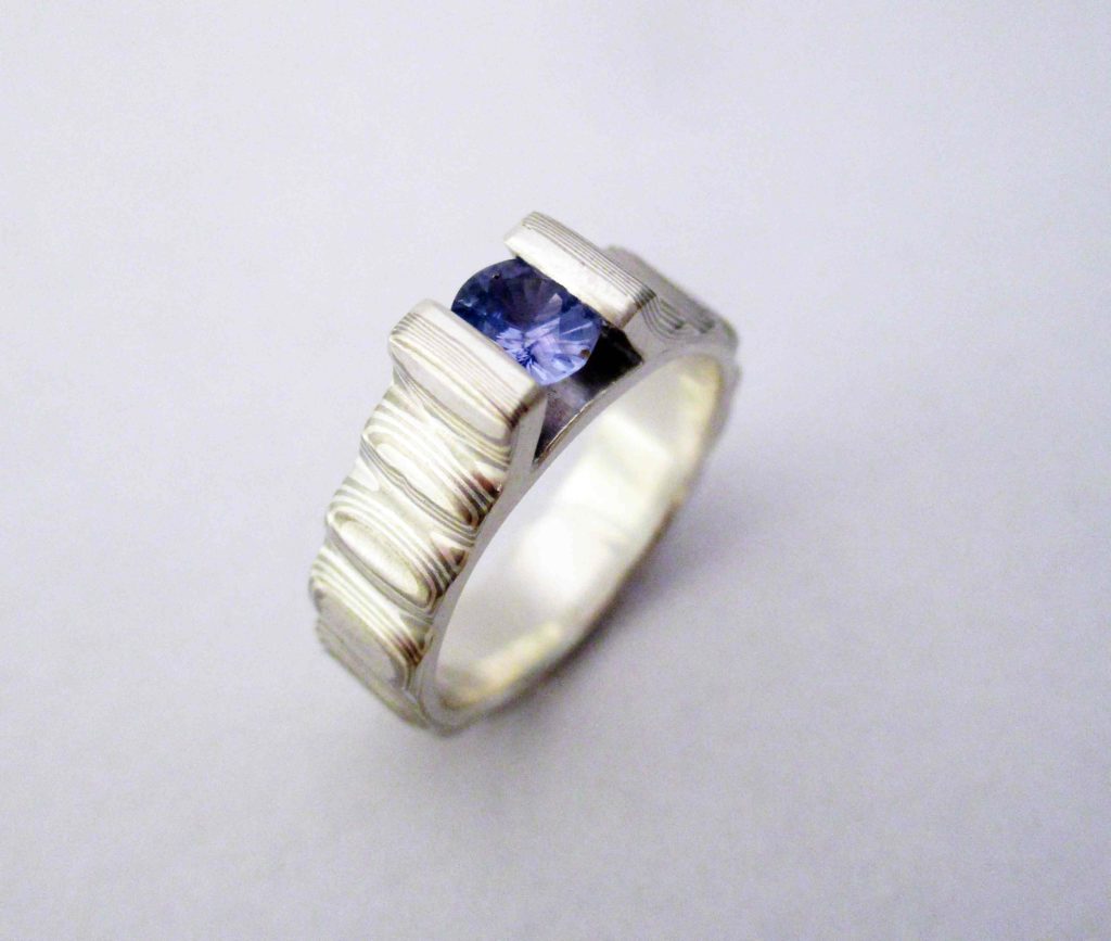 Mokume tulipán eljegyzési gyűrű zafírral 2026.03.02.2026.03.02. Ezüst és palládium, zafír kővel. A gyűrű plasztikáját gyönyörűen kiemelik a párhuzamos rétegzés adta vonalak.