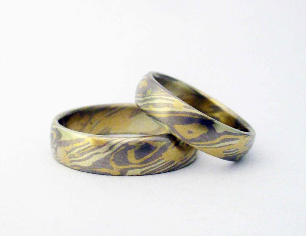 Zöldarany, fehérarany , sárgaarany mokume gane jegygyűrűpár / jgyp0243 2026.03.09.2026.03.16. Zöldarany és fehérarany, megbolondívta egy kis sárgaarannyal 🙂